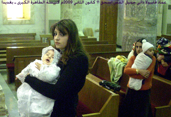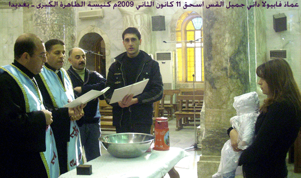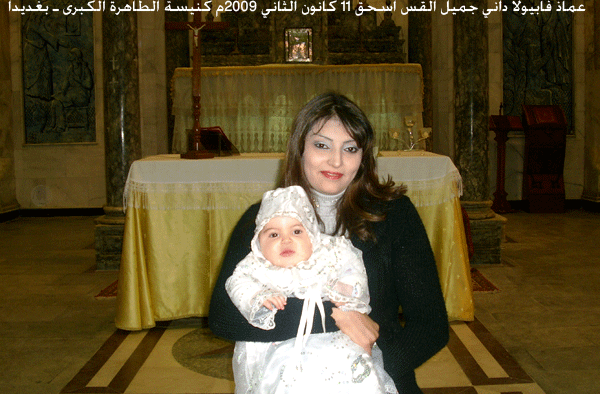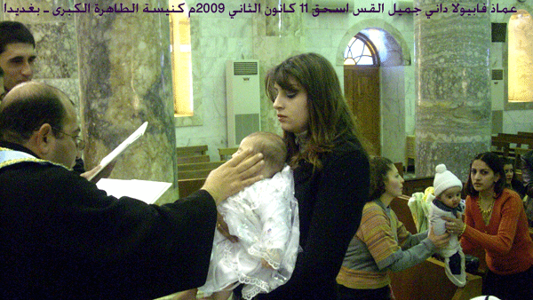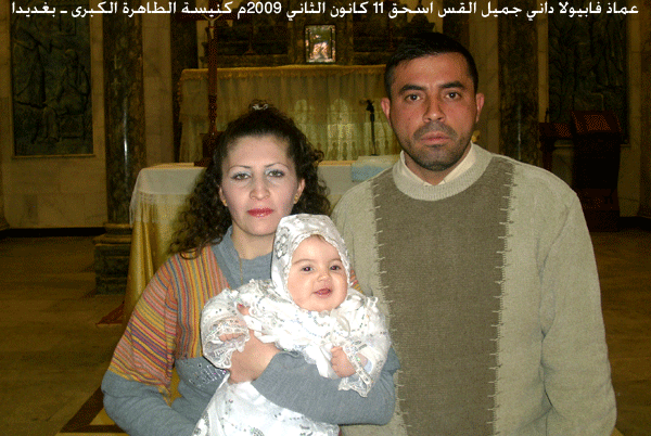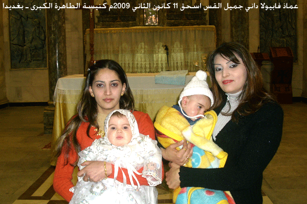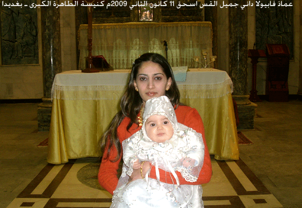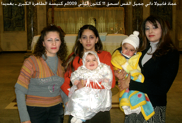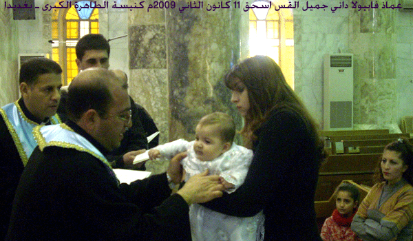 اقتبلت الطفلة فبيولا داني جميل القس اسحق سر العماذ المقدس بتاريخ 11 كانون الثاني 2009م في كنيسة الطاهرة الكبرى، على يد الابوين انور زومايا وثائر عبا. والعرابة الانسة ديانا جميل القس اسحق.