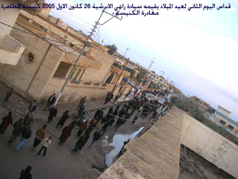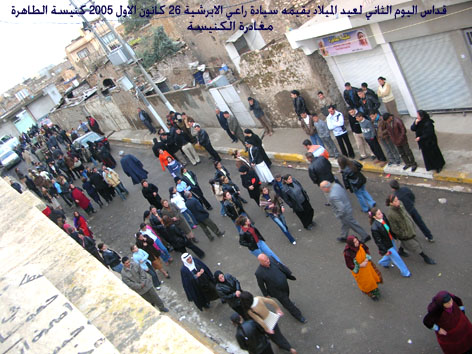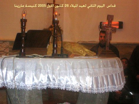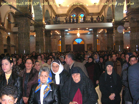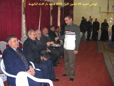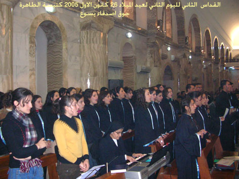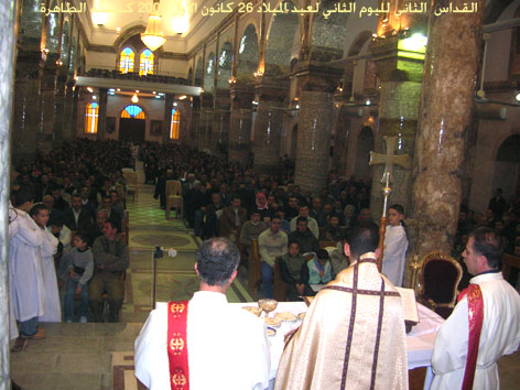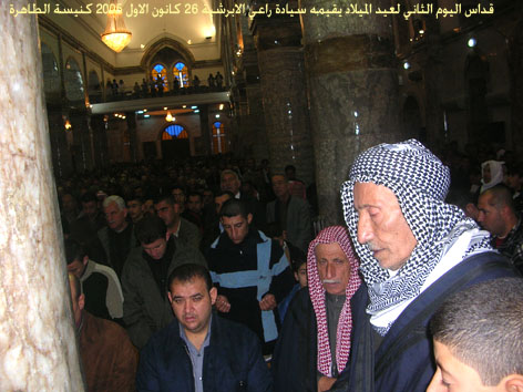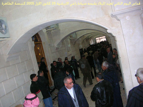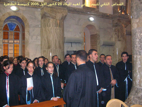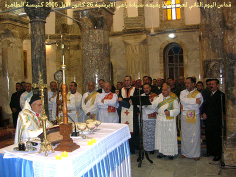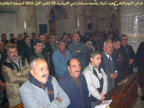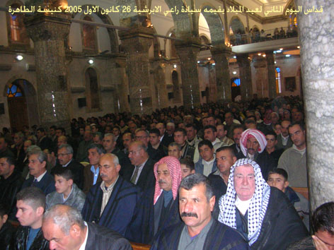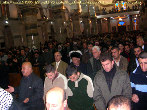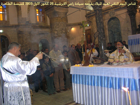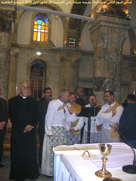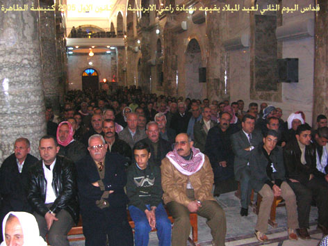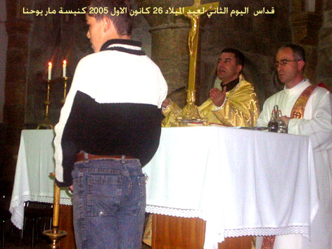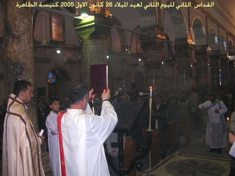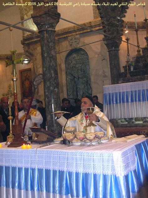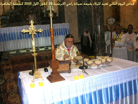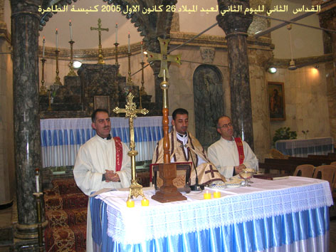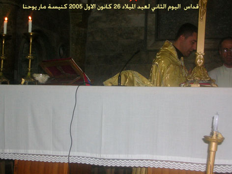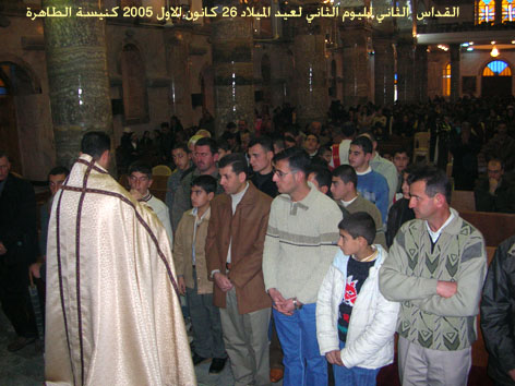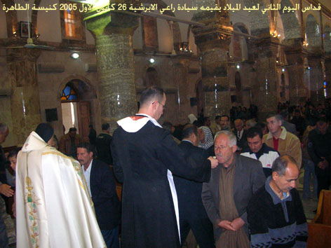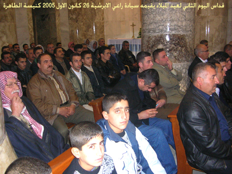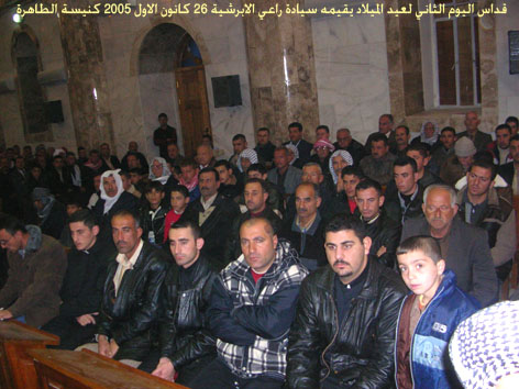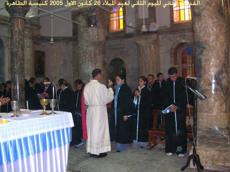 السلام لنا .. يسوع حل بيّننا اليوم الثاني لعيد ميلاد الرب يسوع المسيح تهنئة والدة الله القراءات الروحية اليومية: بحسب طقس الكنيسة السريانية الانطاكية (للمتابعة الروحية). تكوين 17: 15 ـ 19 خروج 3: 2 ـ 8 قضاة 6: 36 ـ 38 1 مل 8: 2 ـ 5 حز 44: 2 ـ 4 رسل 7: 44 ـ 53 عبرانين 2: 14 ـ 18 لوقا 2: 15 ـ 20 و 52 قداديس اليوم الثاني لعيد الميلاد اقيمت قداديس اليوم الثاني لعيد الميلاد في جميع كنائس بغديدا صباحا وعصرا،حيث اقام سيادة راعي الابرشية المطران مار باسيليوس جرجس القس موسى القداس الاول صباح اليوم الثاني لعيد الميلاد في كنيسة الطاهرة الكبرى. تم في القداديس الاعلان عن: الرسامة الانجيلية للراهب سامر نمرود حلاته صباح يوم غد الثلاثاء 27 كانون الاول 2005م بوضع يد سيادة راعي الابرشية في كنيسة الطاهرة الكبرى. الرسامة الكهنوتية للراهب الروكاسيونستي جلال جرجيس الطوني عصر يوم الخميس 29 كانون الاول 2005م بوضع يد سيادة راعي الابرشيية في كنيسة الطاهرة الكبرى.